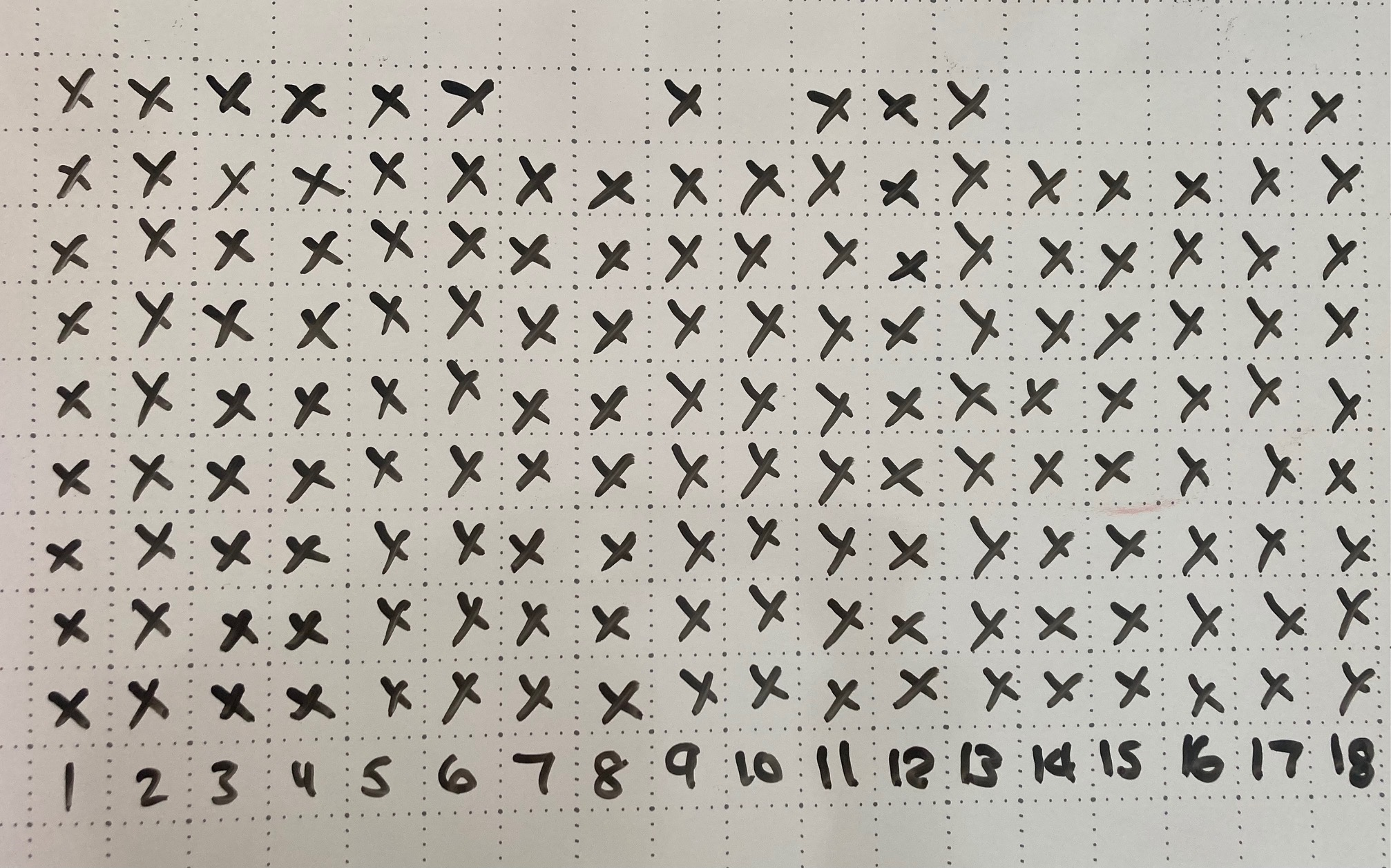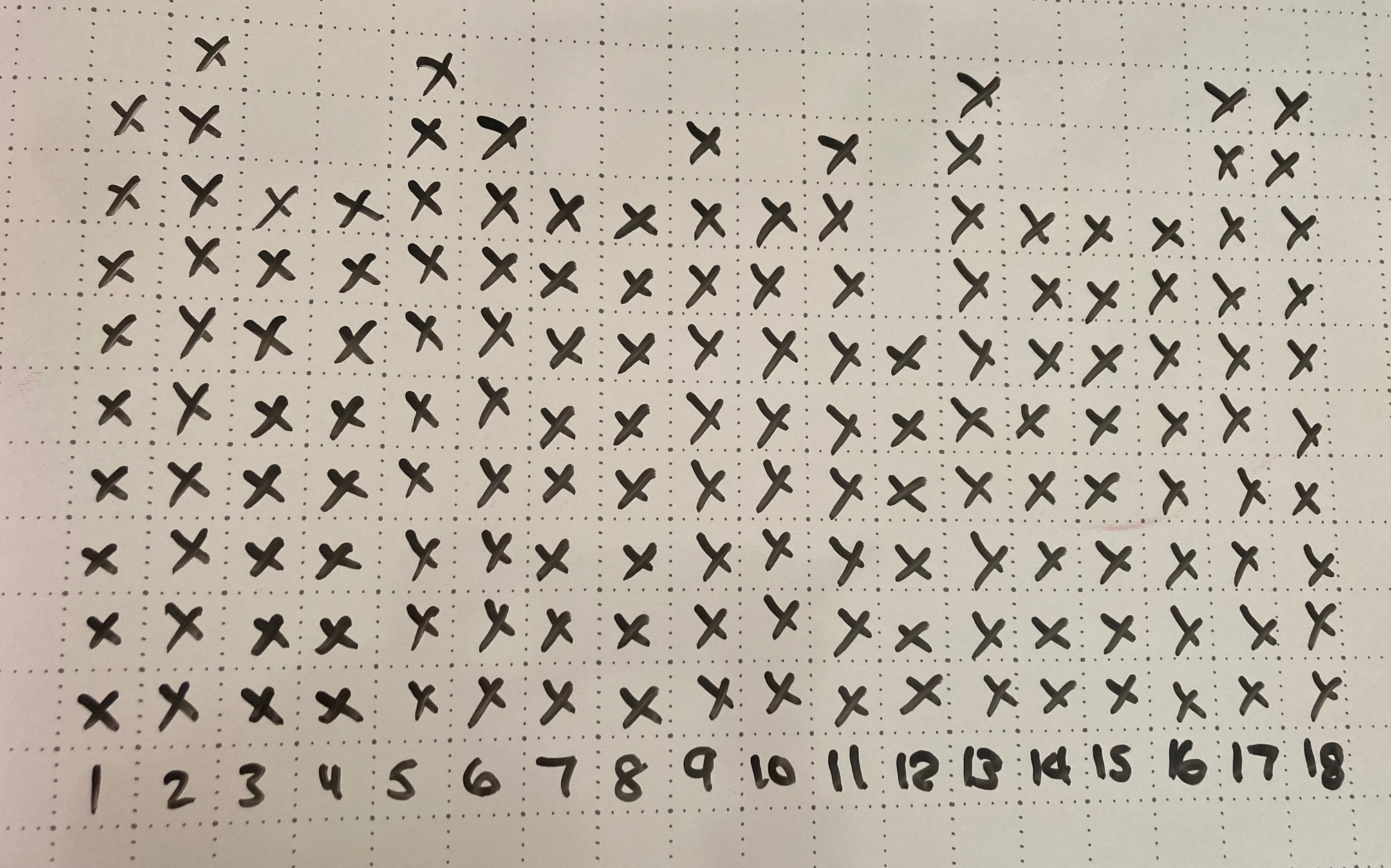 I used a line plot to represent the points for each arrow. Each x represents one point. I decided to rearrange the points so that all of the rows were as even as I could get them. I noticed that most of my rows had nine points. 72 multiplied by 9 is 648. I updated my estimate to 640 because not all rows have nine points.